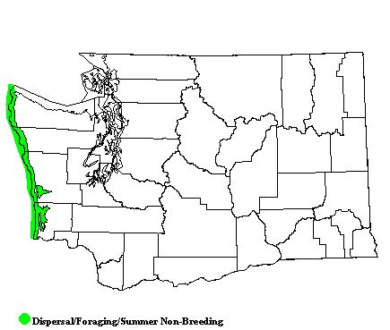 Brown Pelicans may be found along the outer coast from June to October. Numbers can be high at the mouth of the Columbia, in Gray's Harbor, at Ocean Shores, and at Copalis National Wildlife Refuge, a collection of coastal islands, rocks, and reefs from Clallam to Grays Harbor County.